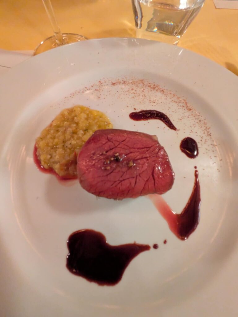 エゾ鹿のローストに添えられたレンズ豆もソッフリットの味だけで滋味深い。鹿肉は体を中から温めてくれる、冬に最適な食材です。