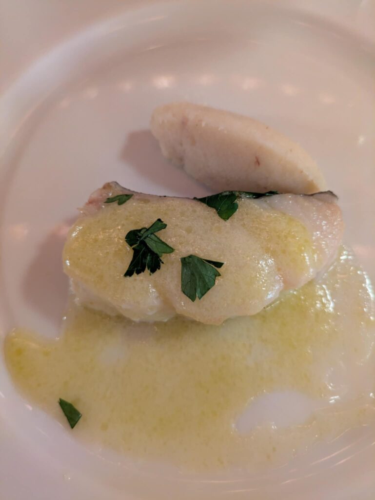 タラのボローニャ風は、代表理事の中村浩子が訳者のひとりである19世紀のアルトゥージの『イタリア料理大全 厨房の学とよい食の術』からシェフが選んでくださいました。タラは歴史的にイタリアのカトリック教が肉食を禁ずる日に食べられ、たんぱく質豊富です。